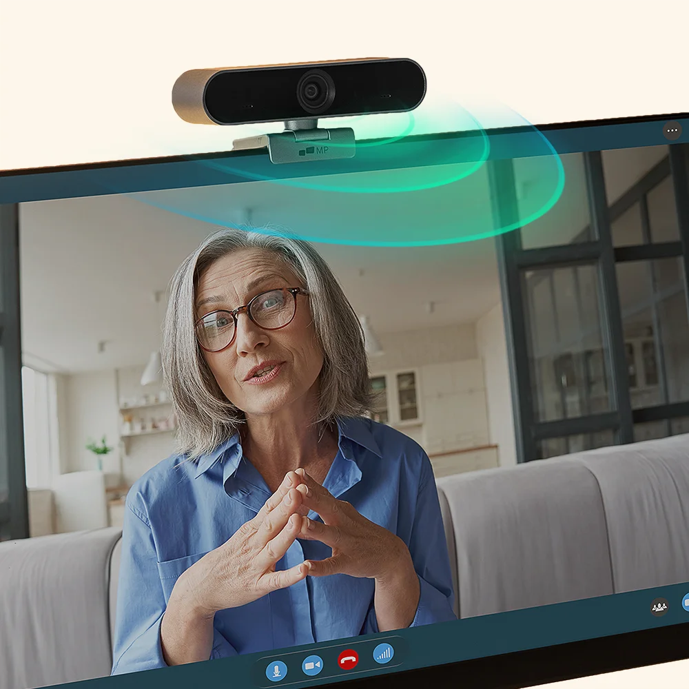 Mobile Pixels 4K AI webcam providing crystal-clear video and a face-to-face meeting experience. It automatically follows you in real time and ensures your image remains in the center. Features a 120° ultra-wide field of view, ensuring everyone in the meeting room can be seen clearly.