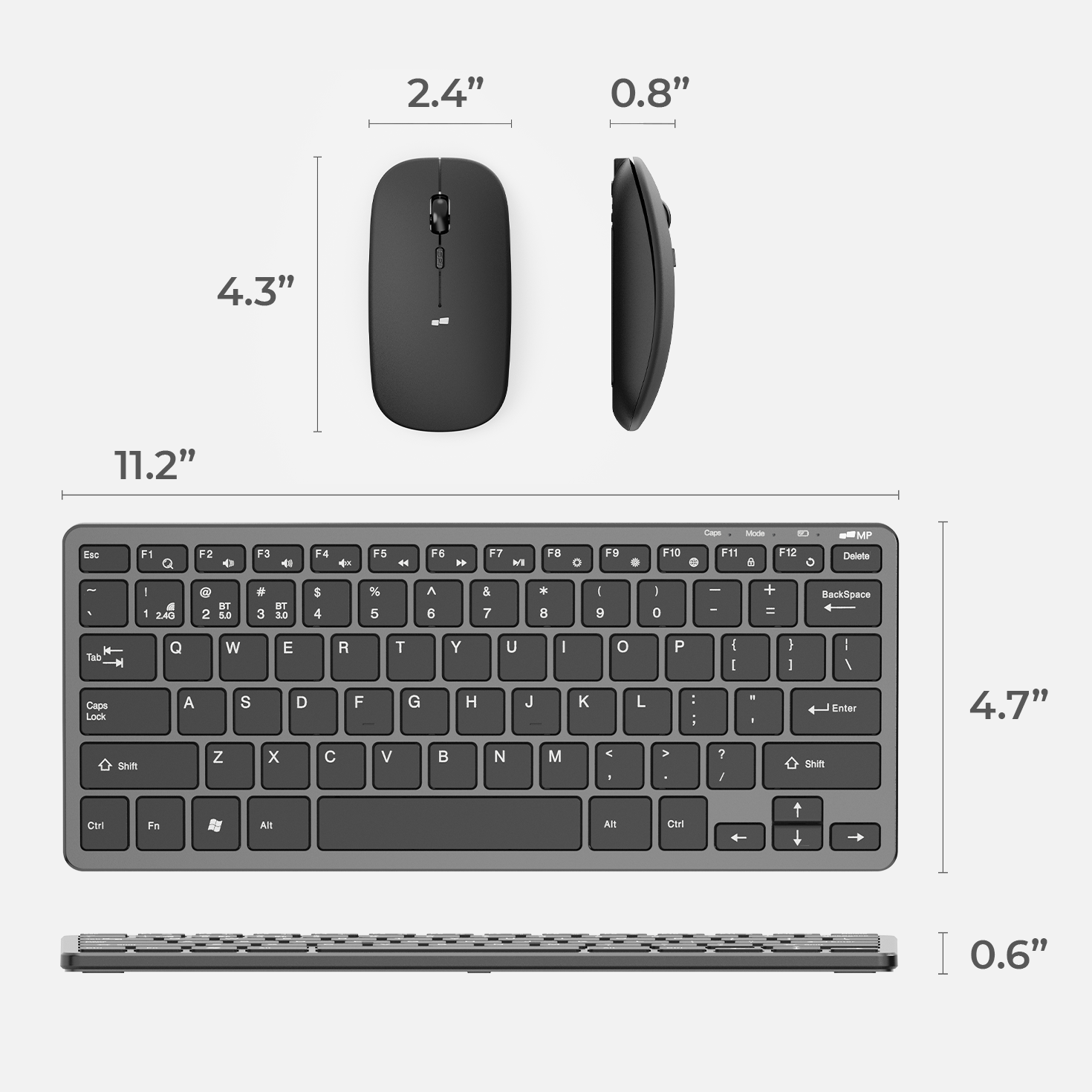 • Mouse: 2.4" x 4.3" x 0.8"